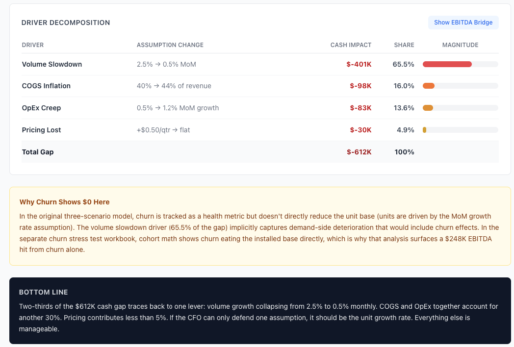 Claude also flagged something useful: if monthly churn crosses 3.5% for two months in a row, you’re about 6 months away from hitting the stress scenario. That’s your early warning signal.