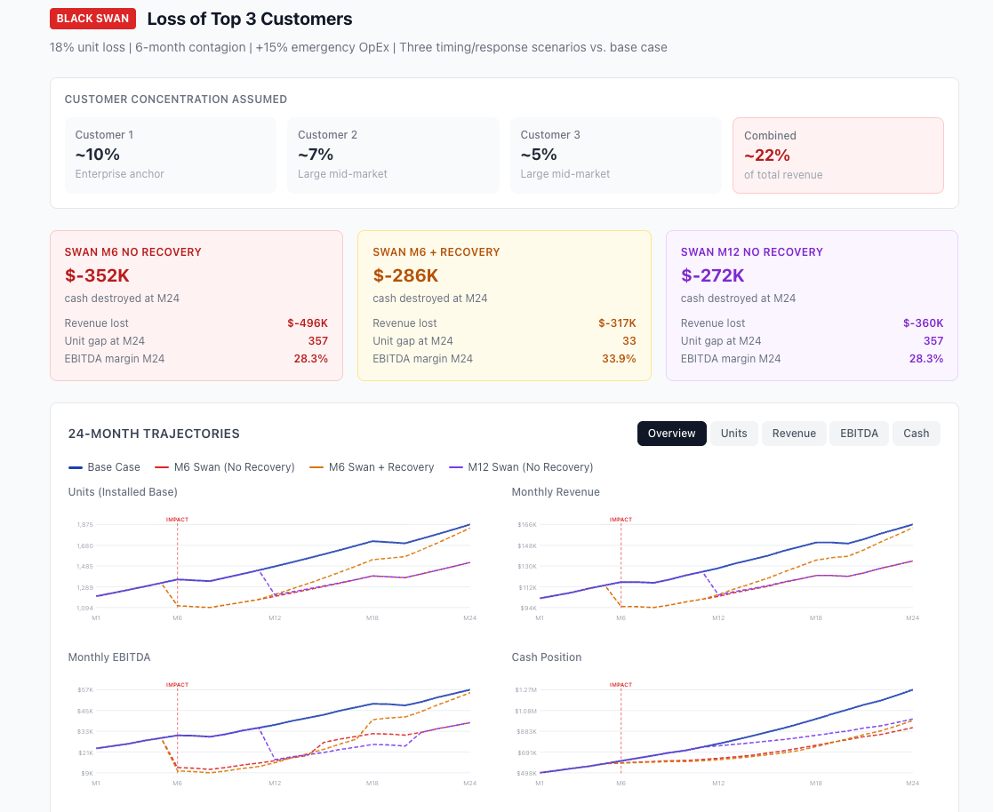 Add a black swan scenario: we lose our top 3 customers.Without a recovery effort: $352K in EBITDA destroyed. Units dropped from 1,358 to 1,111 overnight and took 11 months to rebuild. The revenue from that window is gone permanently.