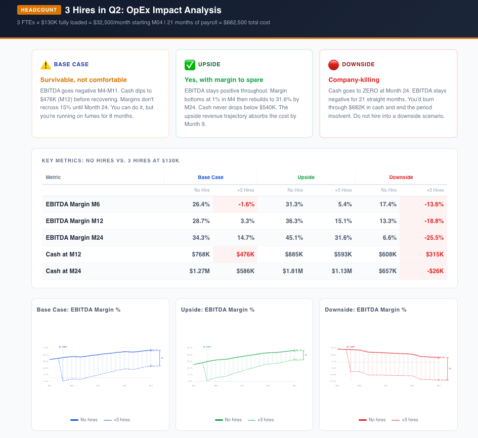 Can we afford 3 more heads in Q2, or only if the upside materializes? Show me the impact across all three scenarios.Claude modeled 3 FTEs at $130K fully loaded, starting Month 4.