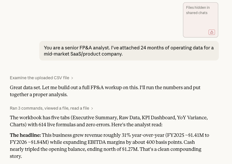 We took 24 months of real SaaS operating data and uploaded it to Claude. Then we spent an afternoon asking it the exact questions your CFO asks you, the ones that normally send you back to the spreadsheet for a week.