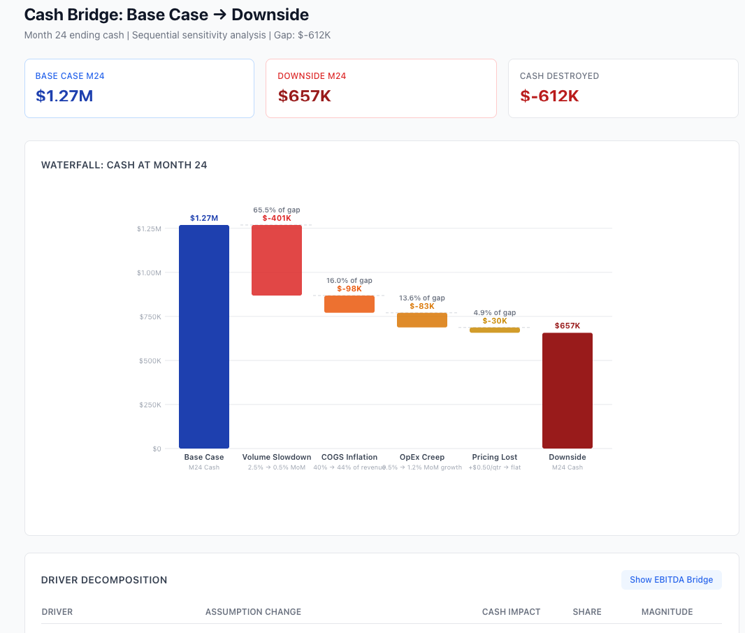 5.Provide a 3-paragraph executive summary written for a CFO: what does the data say, what are the decision points, and what should we monitor monthly. Format output with clear headers and tables. Be specific with numbers.The spread between upside and downside at Month 24: $1.15M in ending cash. The waterfall breaks it down. Volume slowdown accounts for 65% of the gap. COGS inflation takes 22%. OpEx and pricing split the rest.
