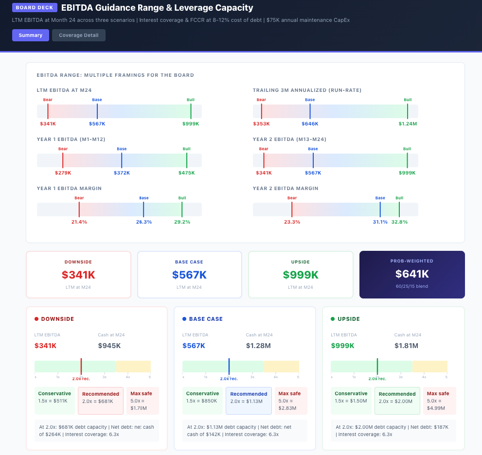 What EBITDA range can we show the board? How much leverage could this business carry at each scenario?”Claude produced EBITDA ranges across multiple framings, a probability-weighted figure ($641K blending base, upside, and downside), and leverage capacity at 2.0x with interest coverage for each scenario.